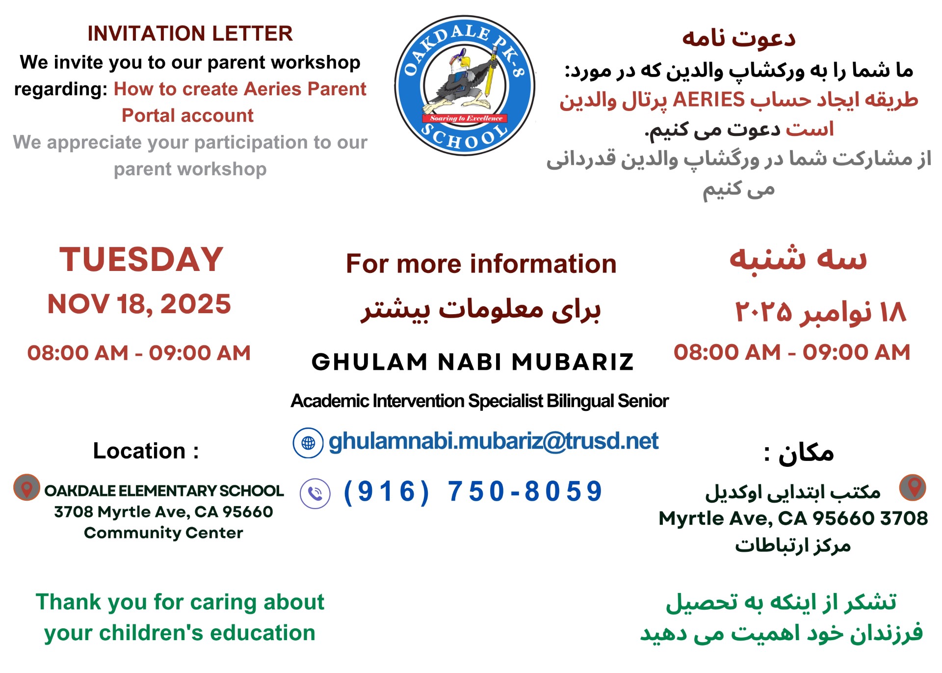 This is a flyer from Mr. Mubariz for Afghan parents to attend a workshop 11/18/2025.